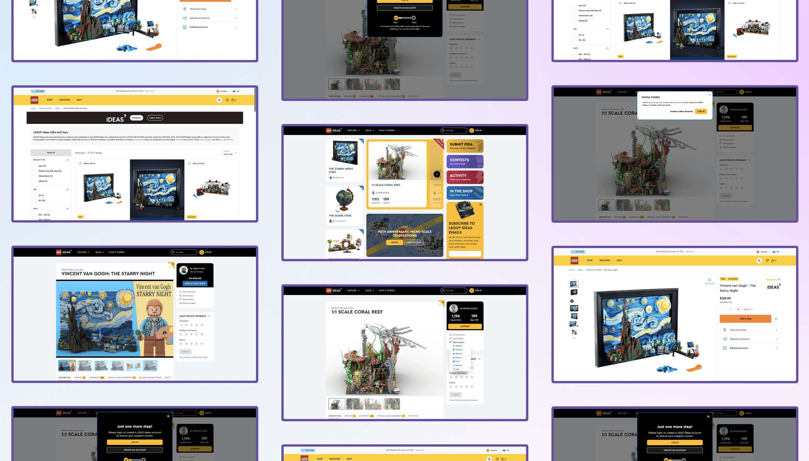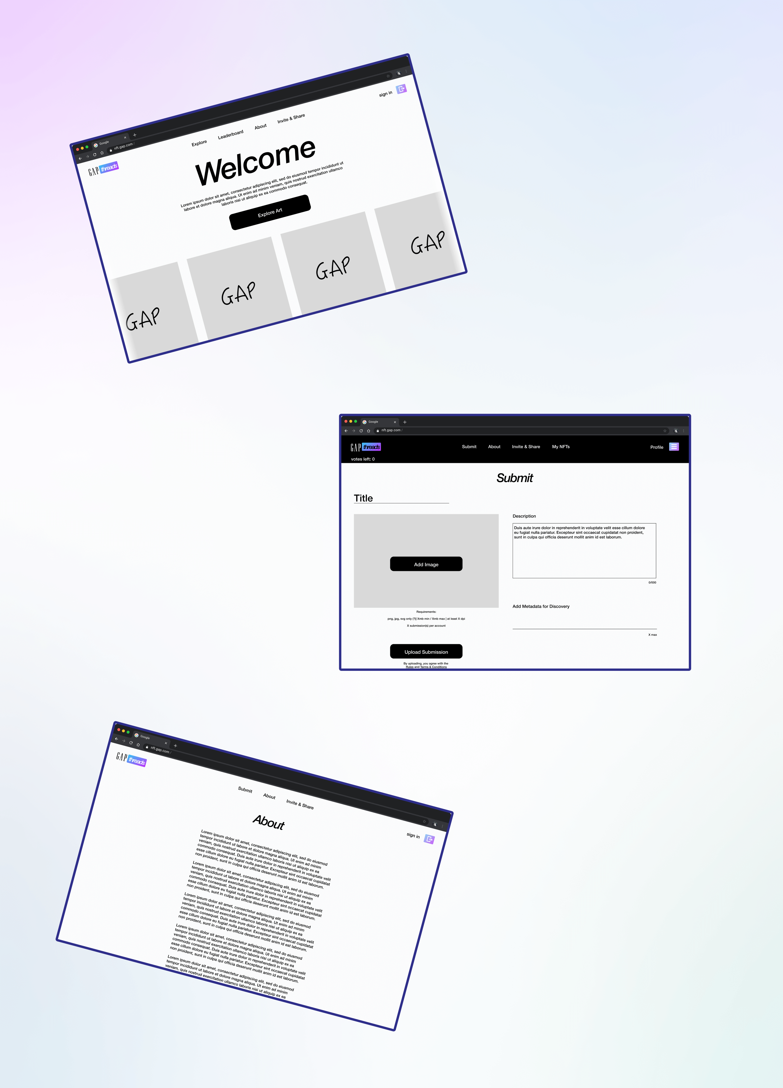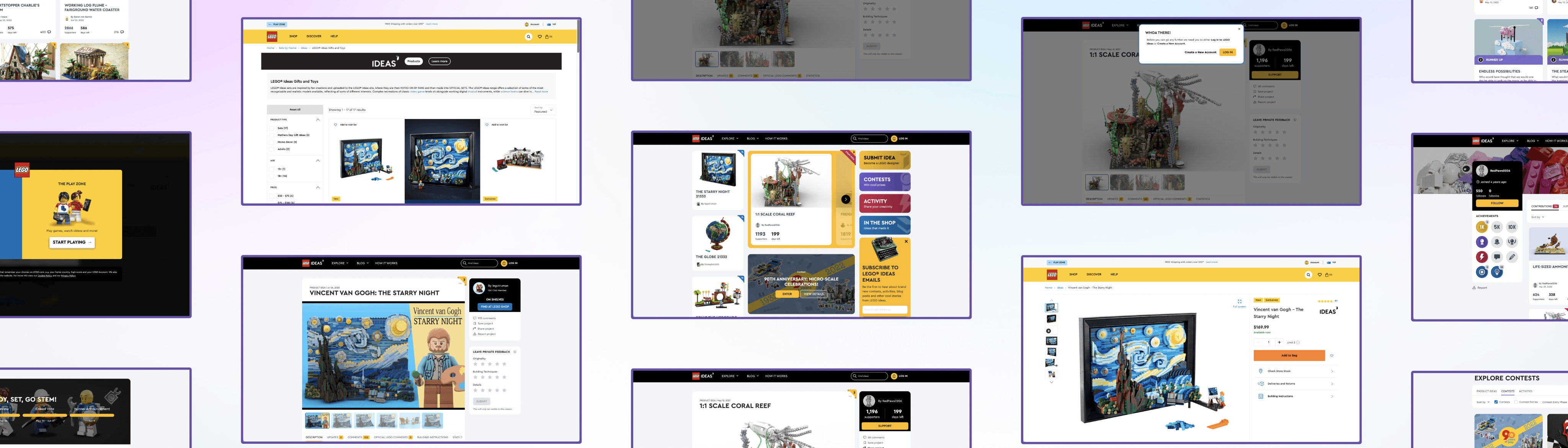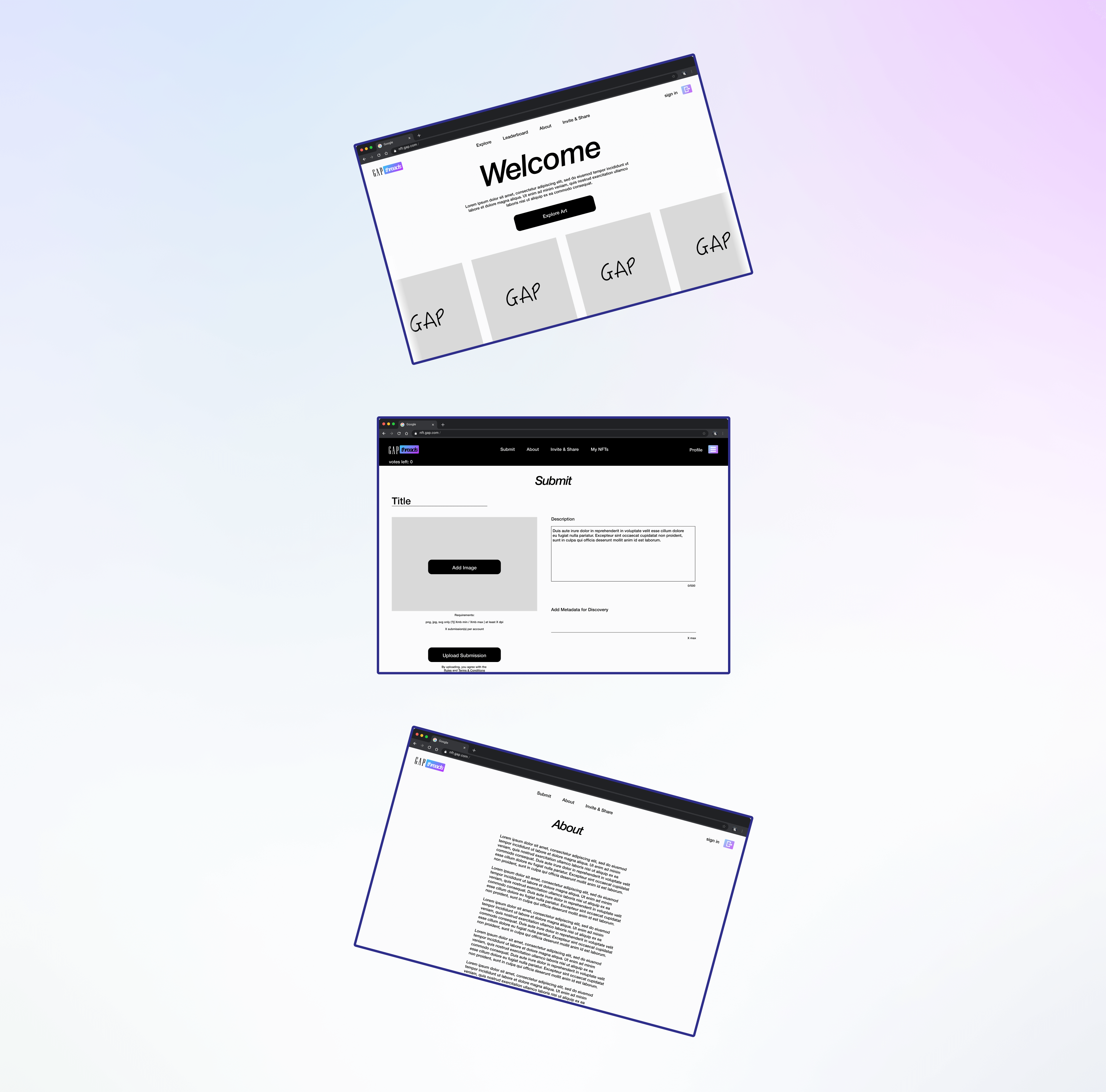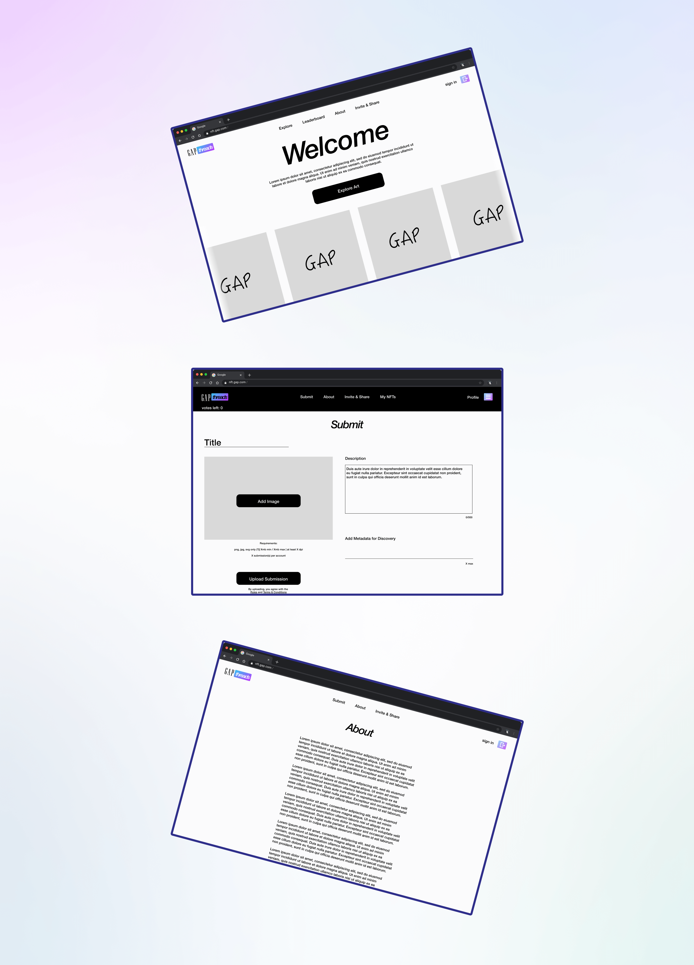 After understanding the business and user needs of Gap Logo Remix, I didn’t start designing wireframes. Instead, I went straight to the web and looked at how other big brands were handling Web3 initiatives and community-based voting. A major source of inspiration was Ideas by Legos. Legos allows their community to submit Lego designs, vote for those submissions, and shop the winners—EXACTLY what we wanted to accomplish for this event!