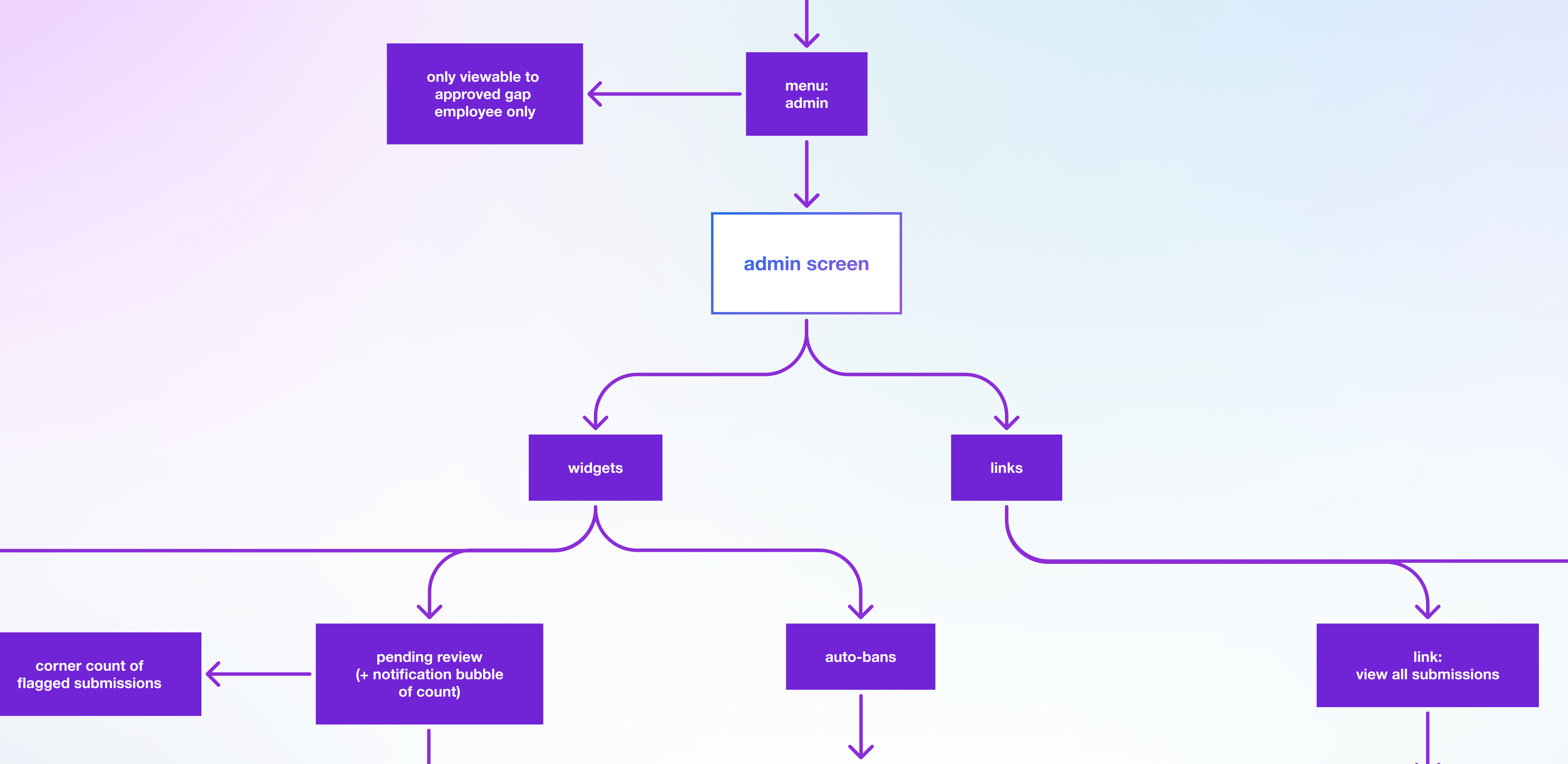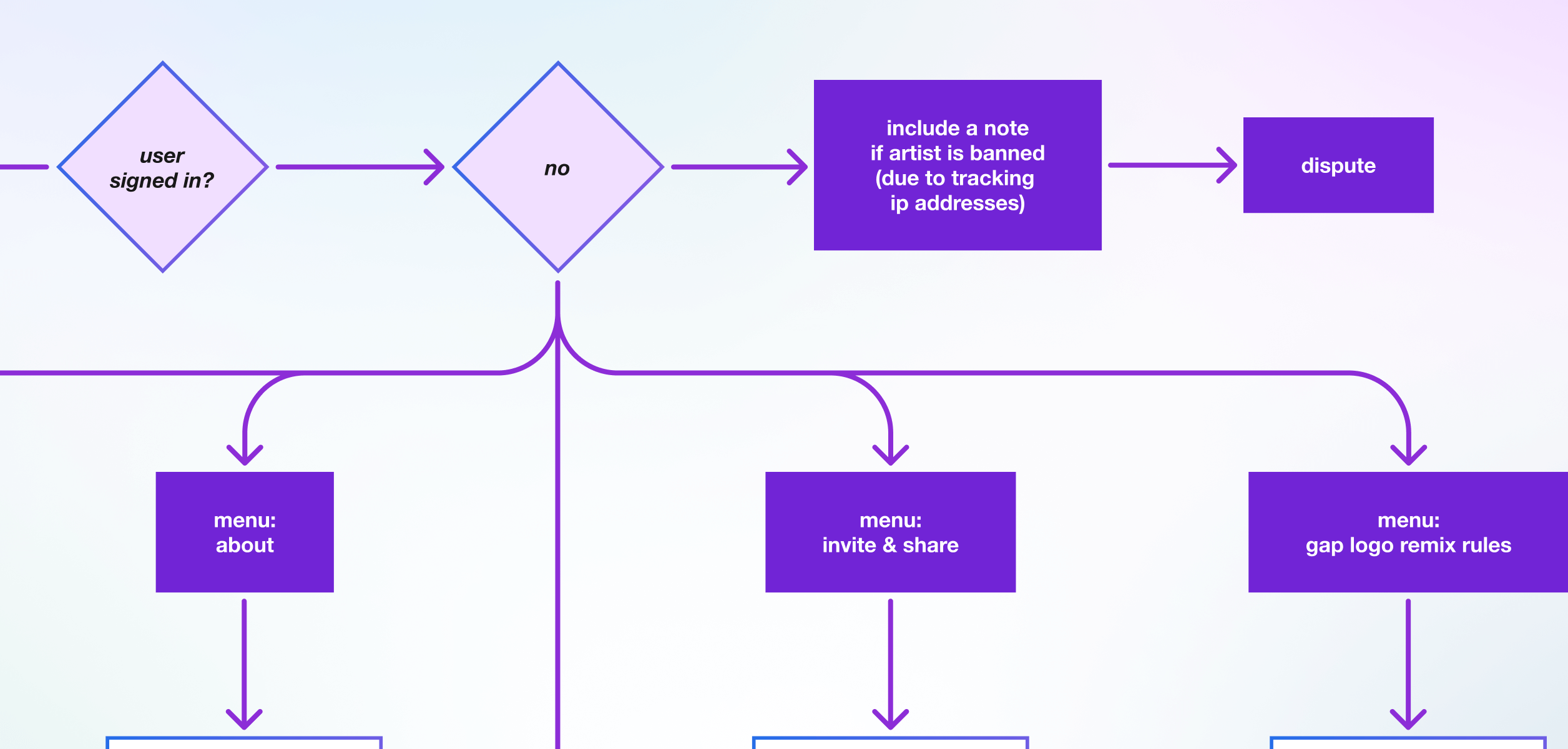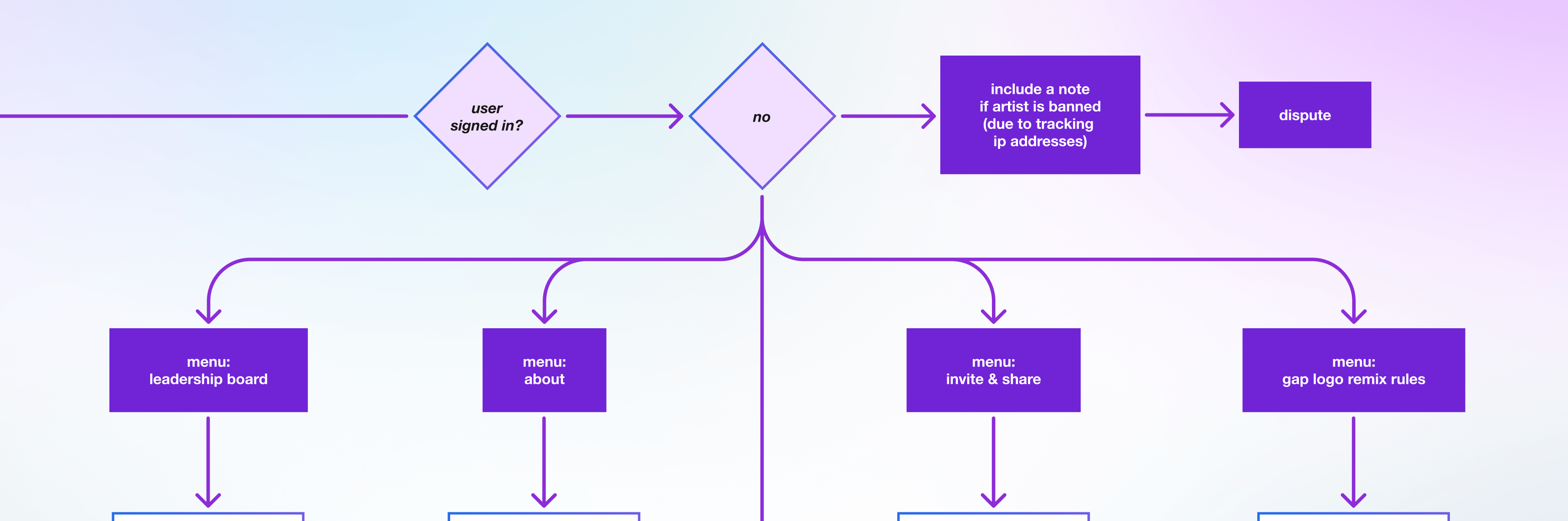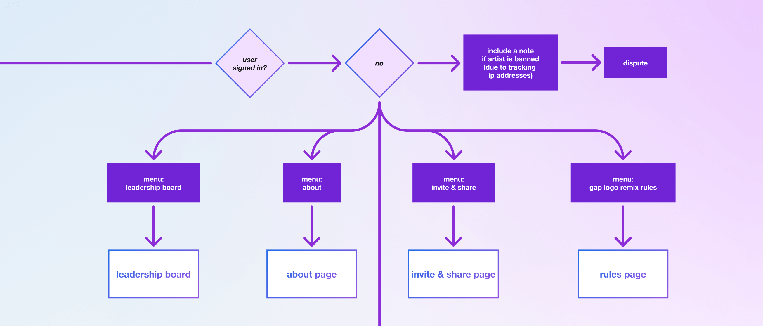 Our external partner, who would host the whole Gap Logo Remix experience, made it clear that I had full creative freedom. So after gathering my design inspiration, I began mapping out three big user flows for the overall contest experience: