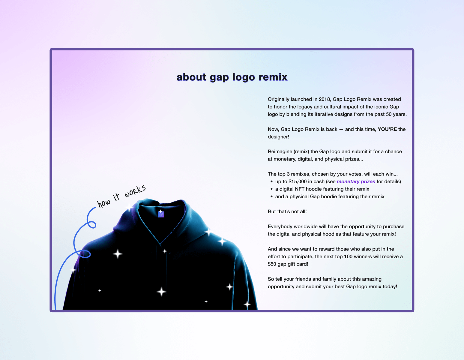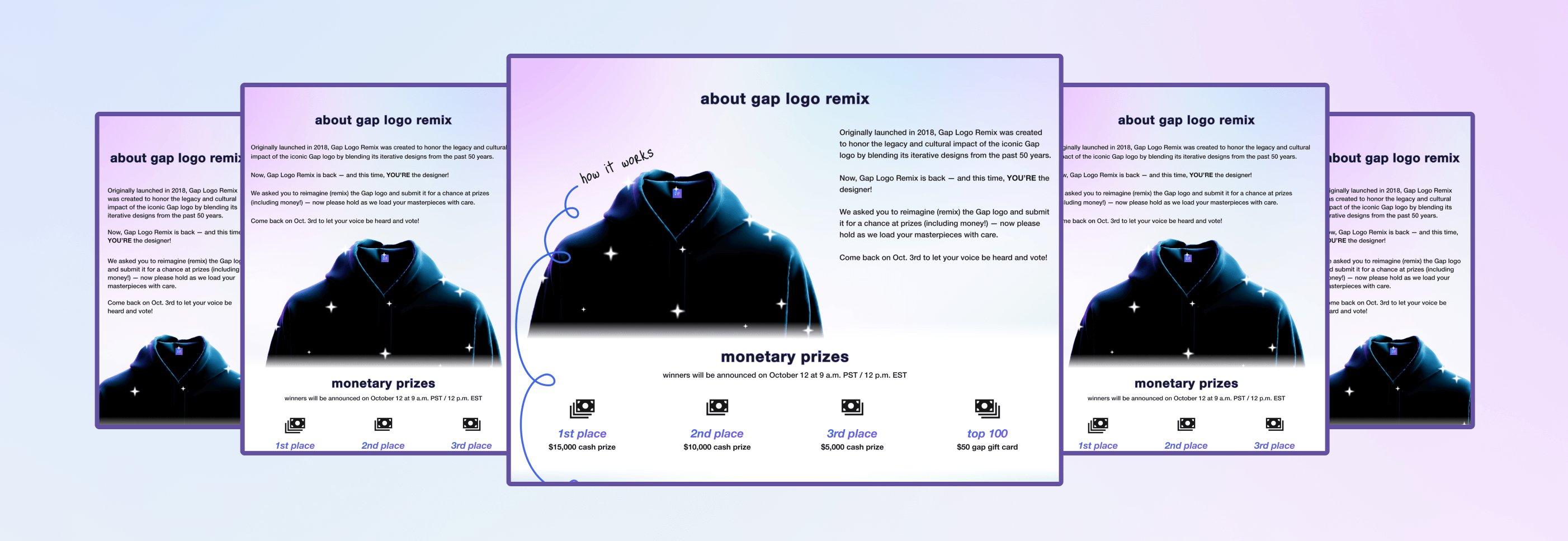 I created a monetary prize summary that was placed beneath the “About Gap Logo Remix” section. While financial incentives can strongly influence participation, this placement just gave a more logical flow for the page.